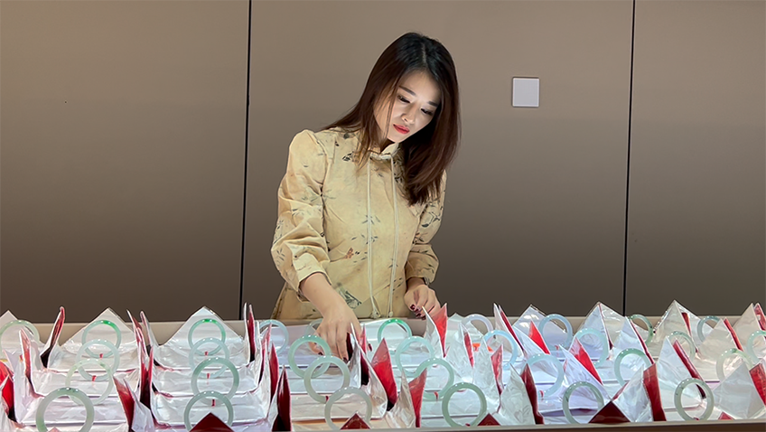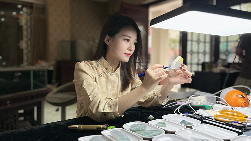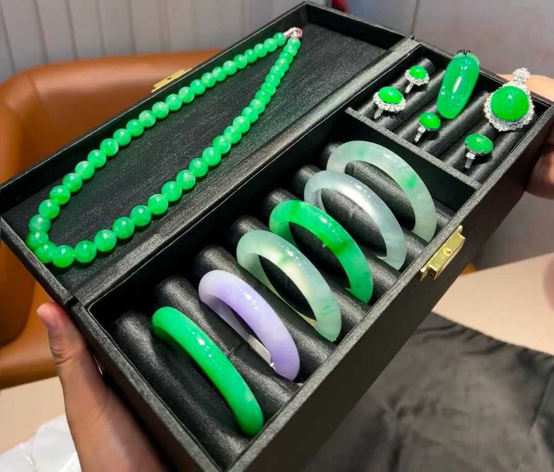 我能夠以第一手的價格拿到翡翠原礦石,再結合寶石的特點,設計、打磨到成品,所有流程都是我們自家完成,我每天都會在朋友圈發一些不同款式的翡翠飾品、擺件。